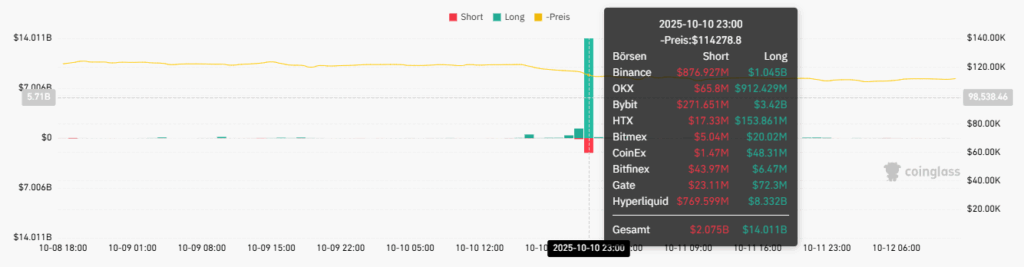 The following charts illustrate the course of the market purge. The first chart shows futures liquidations across major exchanges. The cluster of liquidations around 11 p.m. CEST underscores how quickly nearly USD 20 billion in positions were unwound.