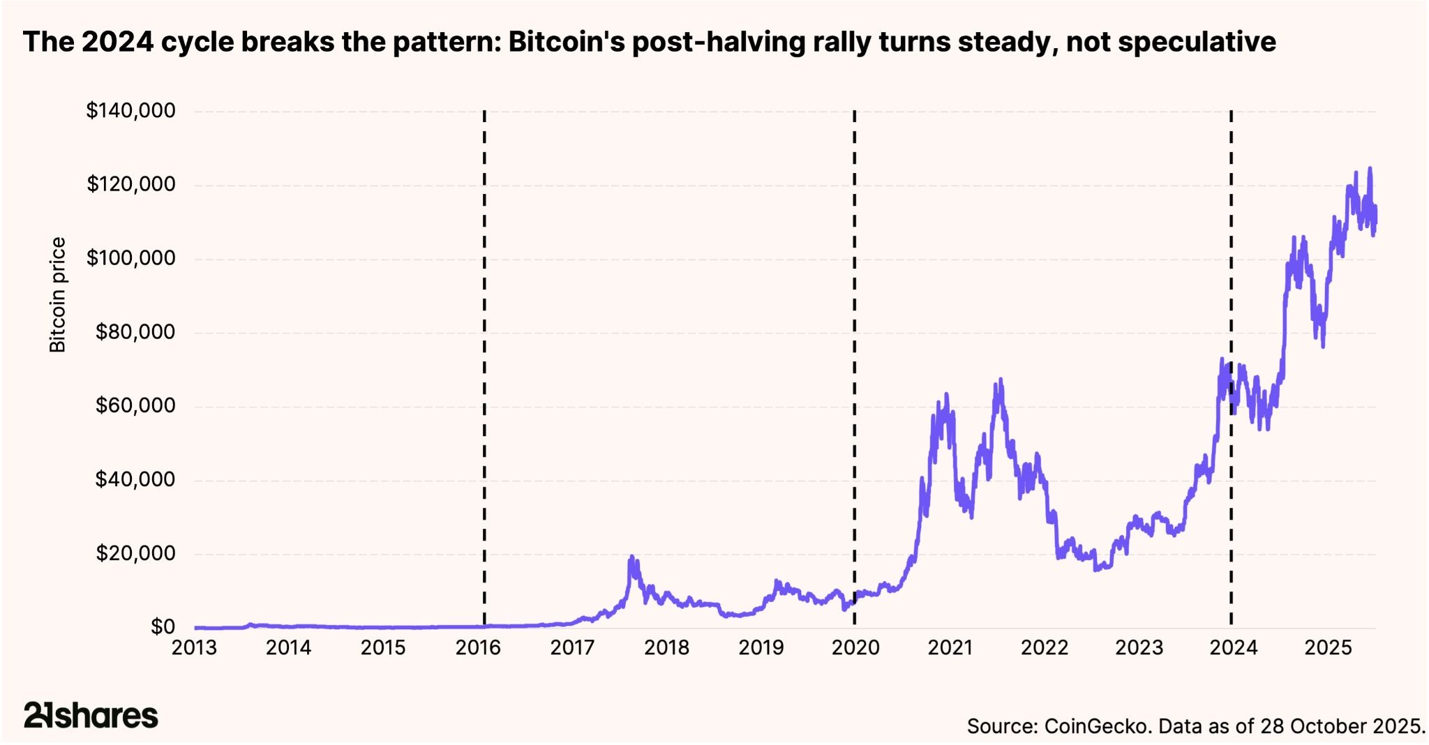 For more than a decade, Bitcoin’s price has followed a familiar rhythm. Every four years, a halving event cuts new supply in half, typically triggering a powerful bull run, a sharp correction, and a long recovery, almost like clockwork. As we approach the end of 2025, that rhythm appears to be changing.