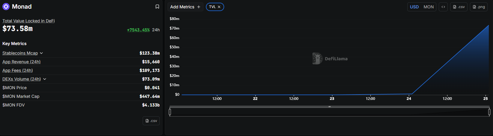 This relatively low initial capitalization does not necessarily reflect a lack of potential but rather the fresh launch status of Monad. At the same time, significant usage metrics have already been recorded: 24-hour transaction fees amounted to just over 109,000 USD, while DEX volume reached around 73 million USD.