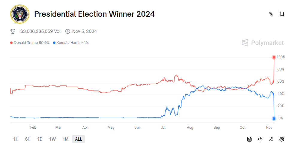 By the end of the elections, users had wagered over USD 4bn on the various outcomes of the US elections. Traders put USD 3.6bn of this volume into the race between Kamala Harris and Donald Trump. Thanks to these impressive numbers, mainstream media outlets such as Bloomberg have since used the crypto app as a primary indicator of election probabilities.