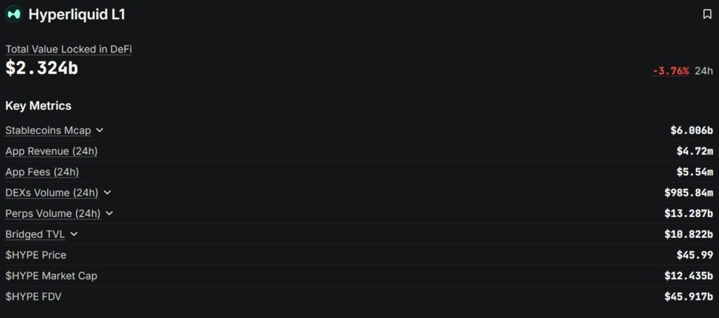 Before examining the technology and product offering in detail, it is useful to consider the latest key figures. The native token HYPE is currently trading at just under 46 US dollars, giving the project a market capitalization of approximately 15.5 billion USD. According to DefiLlama, total value locked stands at around 2.3 billion USD, while daily perpetual futures volume exceeds 13 billion USD. Taken together, these figures underscore how quickly Hyperliquid has established itself as a major player in the DeFi derivatives market.